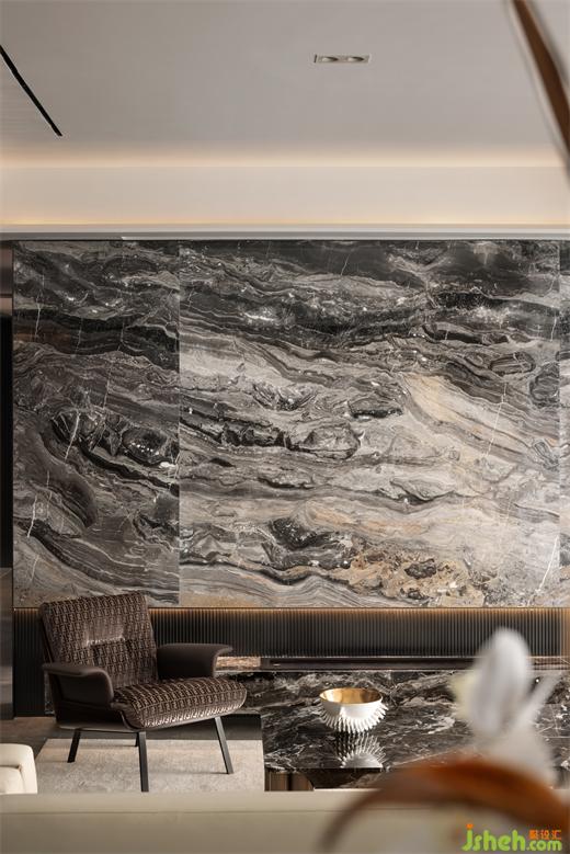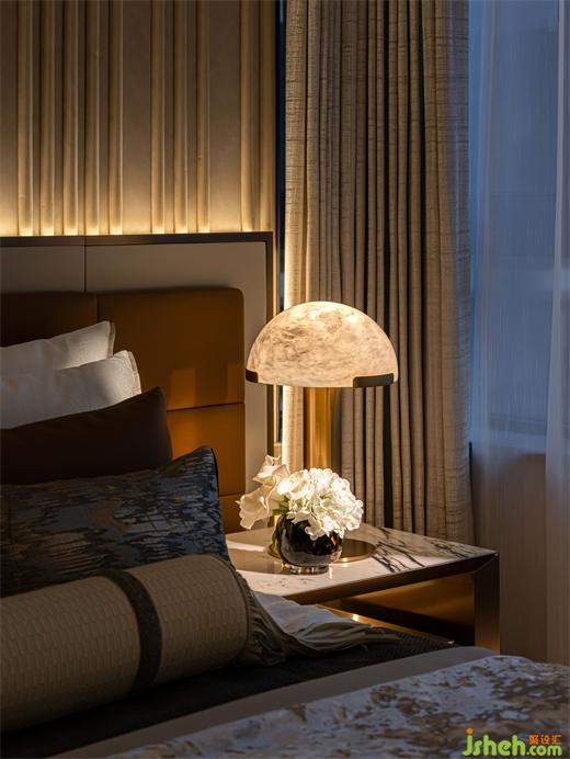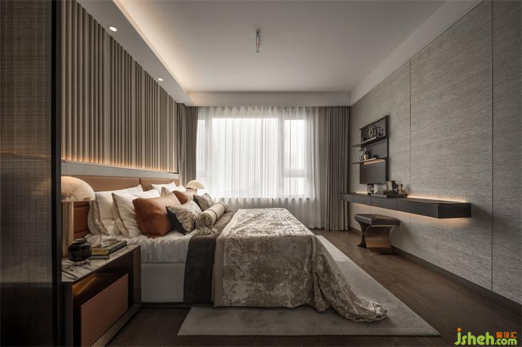 延續(xù)空間簡潔而利落的線條,主臥以低飽和度的灰主導(dǎo)空間配色,柔軟的織物與木質(zhì)的溫潤,恰到好處地突顯了空間的尺度,讓人在走進的一瞬便沉浸于漫卷云舒的松弛之中。