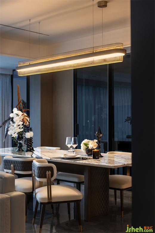 餐廳將剩余客廳空間有效整合,串聯(lián)起場域與生活。在開放聯(lián)動的布局中,各顯其美。餐桌的杯盞奏響一日三餐的樂章,在柴米油鹽的熏染中,于此處感受著升騰的人間煙火。