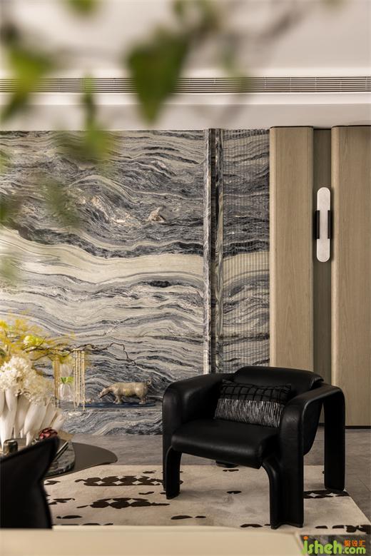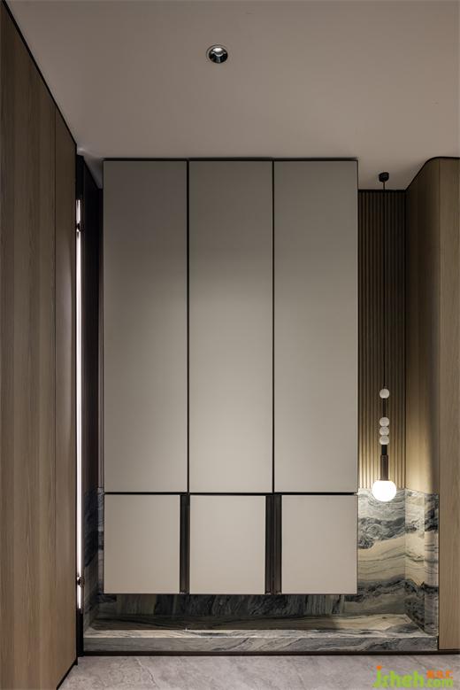空間的故事走向,對生活的熱忱點滴,交由時光來釀造,譜寫在有序的起承轉(zhuǎn)合里。玄關(guān)為入戶的第一視野,大理石的紋路像遠(yuǎn)處的云層一樣延伸至遠(yuǎn)處,懸掛的置物柜將生活瑣碎一應(yīng)收納。
