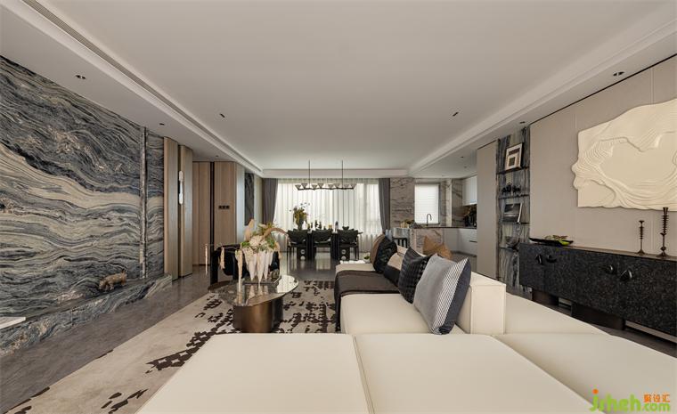 右轉(zhuǎn)進(jìn)入客餐空間,客廳以大塊面布局分割,在各個節(jié)點的大開大合間,樣板房設(shè)計保持整體性,滿足多樣化的生活場景。電視背景墻以石材與木飾面造型相結(jié)合,立面的線條在縱橫間被延長,不同材質(zhì)的組合碰撞下,以藝術(shù)般的感召力強(qiáng)調(diào)了視覺的美學(xué)力量。