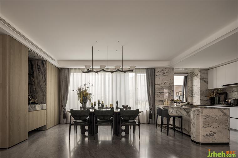 島臺鏈接廚房和餐廳,生活中的交互可輕松展開。餐廳右側(cè)柜體嵌入背景墻奢石,一體化的形式下更添品質(zhì)屬性。皮質(zhì)座椅與大理石餐臺相得益彰,優(yōu)雅如時光般游走于空間中,記錄每一次的餐前儀式和共聚之歡。