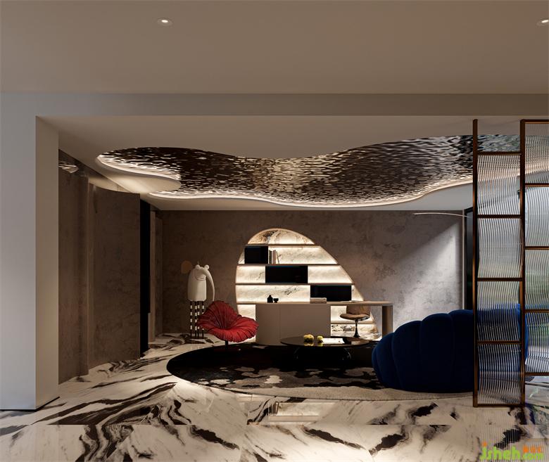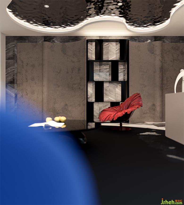 弧形墻面的鏤空層板與頂面的不規(guī)則波紋不銹鋼板遙相呼應(yīng),藍色的Roche-Bobois沙發(fā)與紅色Bloom單椅色彩大膽撞擊,烘托強烈的時尚氛圍。
