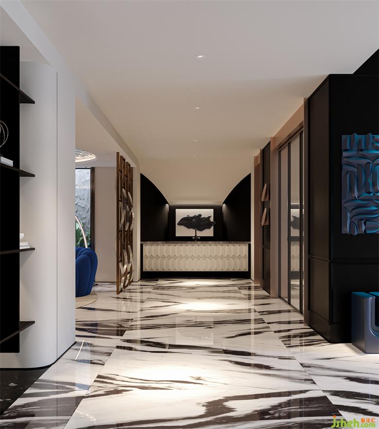 The entrance of the first floor is treated asymmetrically. The semicircular art glass partition plans the moving line of walking. The functional separation does not block the extension of vision, leading people to explore inwards..