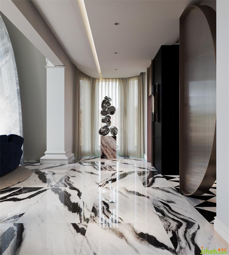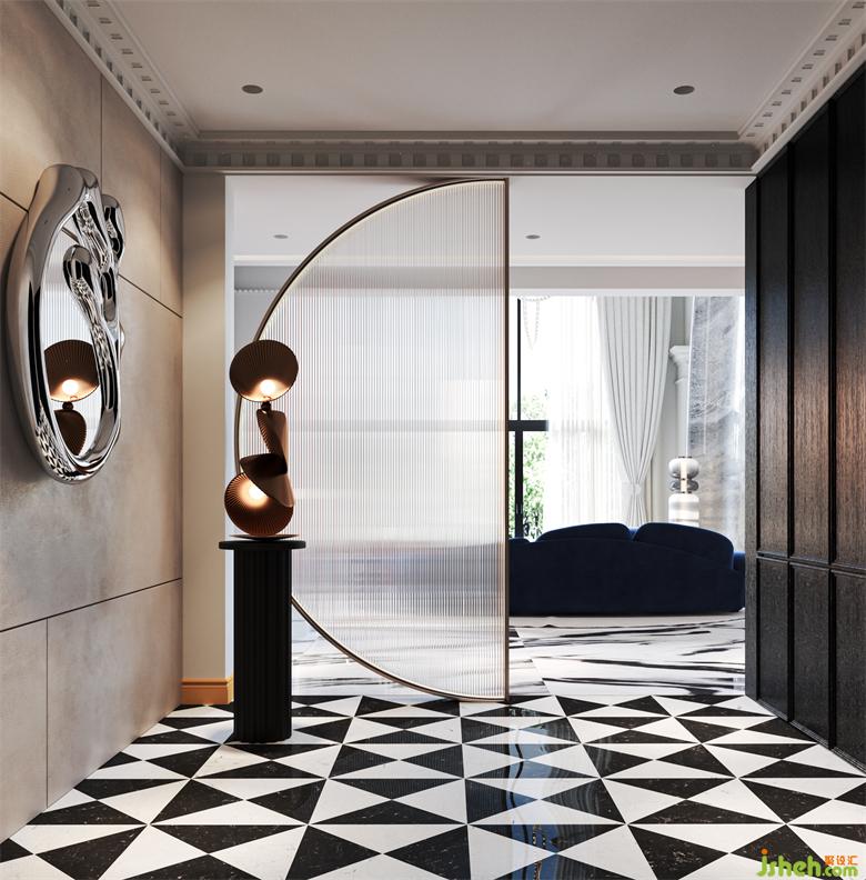 一層的入戶處做了非對稱式的處理,半圓形的藝術(shù)玻璃隔斷規(guī)劃出行走的動線,別墅設(shè)計功能上的分離卻又不阻擋視線的延伸,引導(dǎo)人向內(nèi)探索。