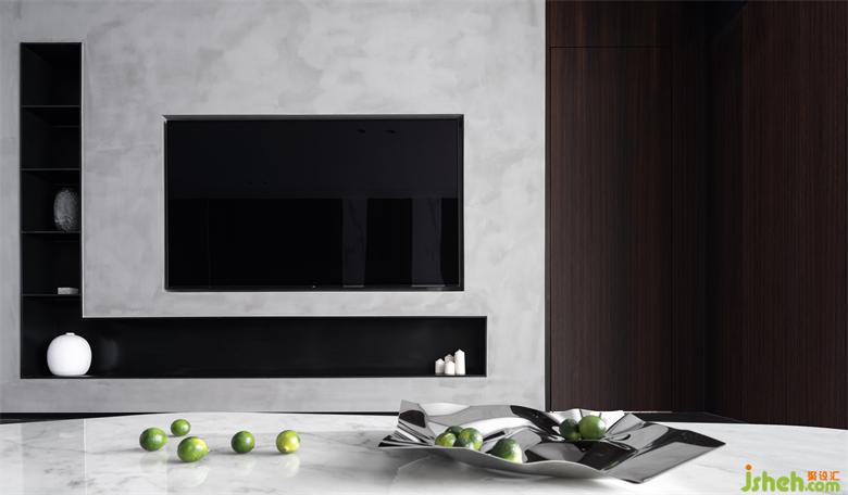 清水混凝土質(zhì)感的藝術(shù)漆勾勒出電視墻的大致線條,完全內(nèi)嵌的電視機(jī)與不銹鋼超薄開(kāi)放層板營(yíng)造出簡(jiǎn)約的處理手法。