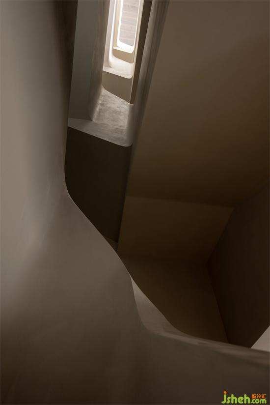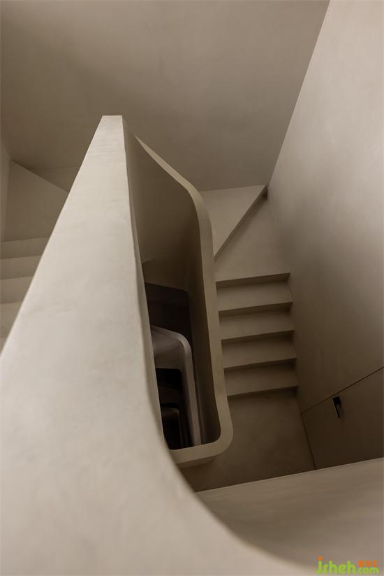 為了保留極致的形態(tài)美感,多余的材質(zhì)都會破壞樓梯本身的質(zhì)感,所以選用一體化的微水泥材料來對樓梯進(jìn)行覆蓋,景瑞無雙別墅設(shè)計讓整個樓梯仿若一個建筑裝置一樣矗立于這個五層的縱深空間之中。