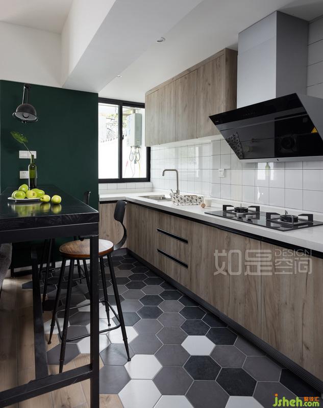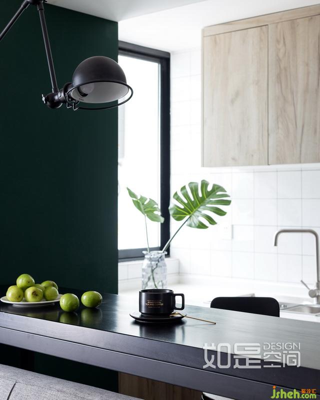 另外,很重要的一點(diǎn):室內(nèi)設(shè)計(jì)師設(shè)置了一個(gè)吧臺(tái)。此吧臺(tái)可以巧妙的把客廳和廚房劃分開(kāi),并且解決沙發(fā)沒(méi)有靠背的問(wèn)題,顯得客廳整體空間更大。