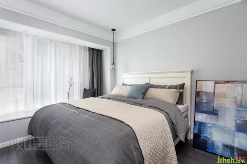 主臥同樣采用無主燈的簡潔設(shè)計。床頭一側(cè)點綴性懸掛極簡吊燈,帶來優(yōu)雅藝術(shù)感。