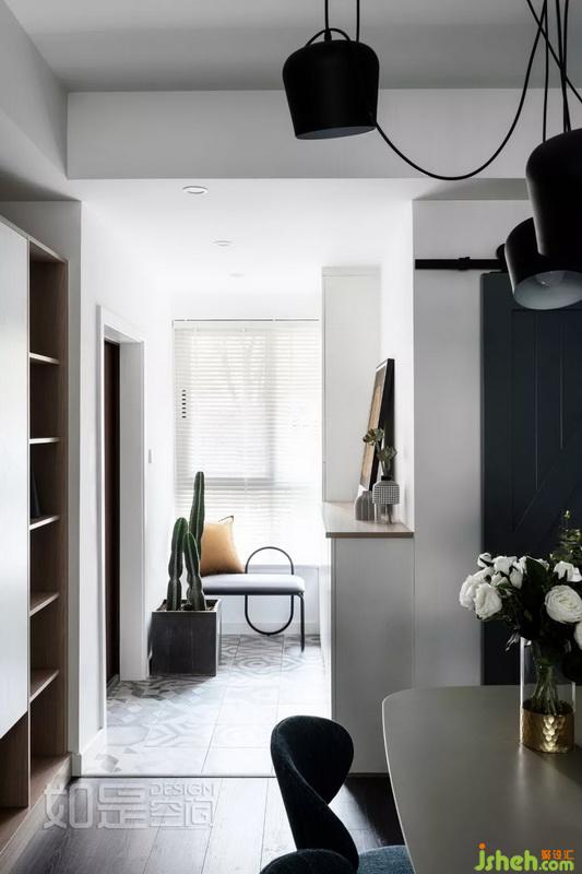 因入戶區(qū)較窄,室內(nèi)設(shè)計(jì)師只設(shè)計(jì)了一部分柜體到頂,靠近餐廳這邊則為半截柜。在滿足功能性的同時(shí)也化解了空間壓抑感