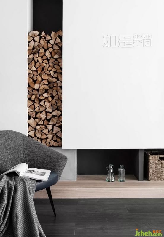 室內(nèi)設(shè)計(jì)師在局部采用深綠、淡藍(lán)、淺灰色的同時(shí),依然保留了大面積空間的純白,以塑造基本的純凈感。電視墻左側(cè)木柴的堆砌則體現(xiàn)出獨(dú)特別致的北歐元素。