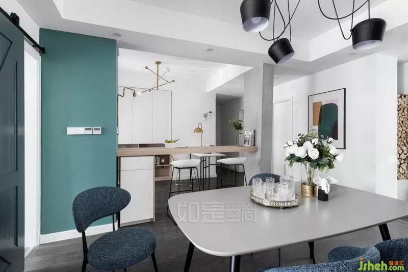 餐桌桌面室內(nèi)設(shè)計(jì)師選用與餐廳茶幾同色同紋理的臺(tái)面,餐椅則選用了與休閑椅同色的深藍(lán)色,形成呼應(yīng)