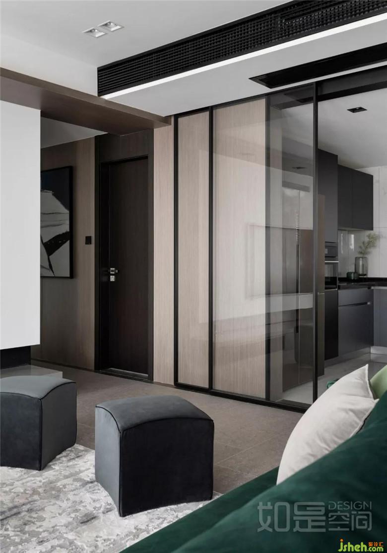 業(yè)主想要開放式廚房,但又擔(dān)心油煙問題!所以室內(nèi)設(shè)計(jì)師將玻璃設(shè)計(jì)為外掛,顯得實(shí)用、通透、有質(zhì)感。打開之后兩米寬的門洞,讓客廳的視野有了很大延伸。