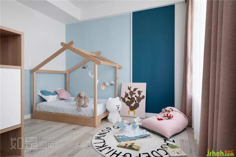 深藍(lán)色黑板漆以及粉色軟裝,結(jié)合溫潤(rùn)的原木色家具,打造了溫馨可愛(ài)的兒童房。小朋友可以在懶人沙發(fā)看書,也可以趴在地毯上畫畫。