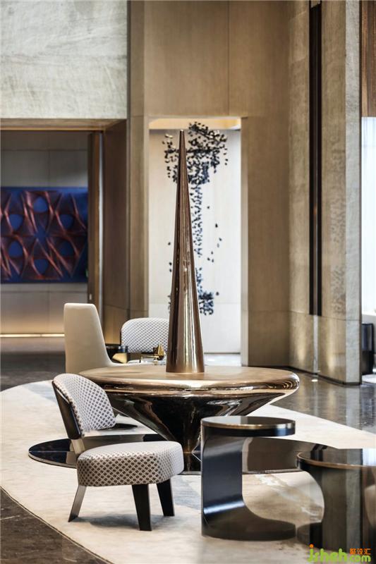 金屬飾面的陀螺裝置,定格在旋轉(zhuǎn)的狀態(tài)卻又靜止恬然,如賓江路五號在時代的川流不息中獨具坦然與自在。室內(nèi)設(shè)計師