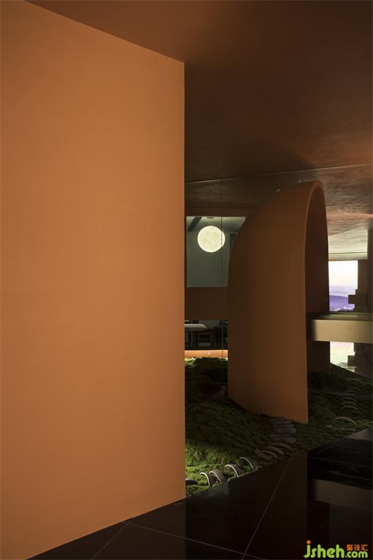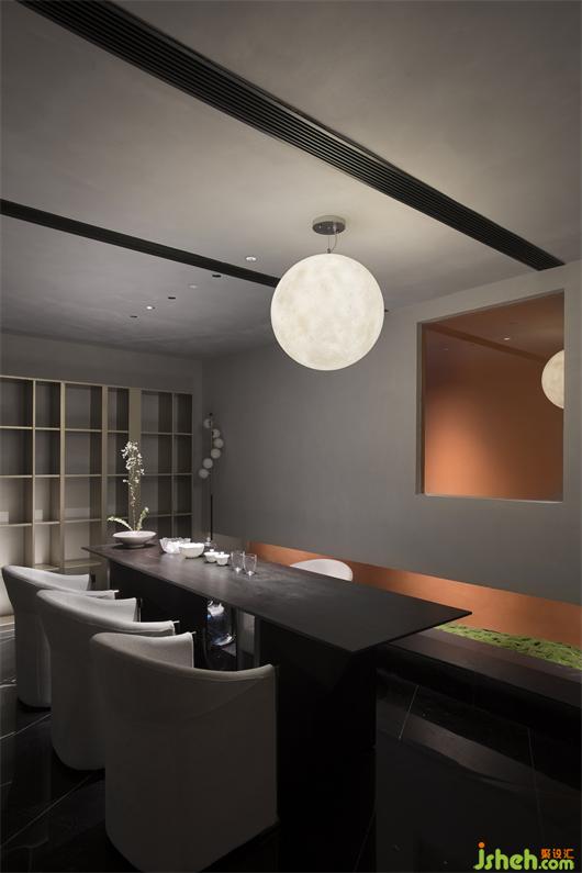 延續(xù)了流動形態(tài)的線條語素,同時以取自甲板的暖木色調(diào)、木藝材料裝點,從一種全新的角度詮釋感官沉浸的??臻g布設月球元素吊燈,將人的視線還給自然意向,模糊內(nèi)外與自然的界限。