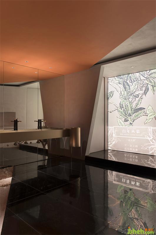 以游艇船艙中的溫潤木質(zhì)和華麗燈膜表現(xiàn)出悠閑的度假氛圍,玻璃鏡面折射出極具張力的光影變化,洗手區(qū)域設計通過頂部和墻面花卉幕布的結合,構建出目之所及,皆為景色。