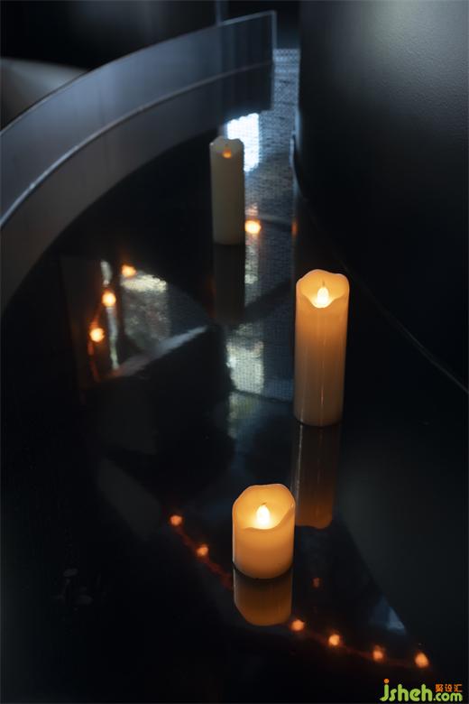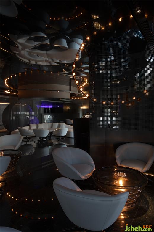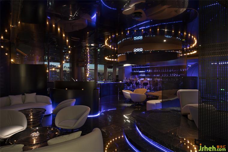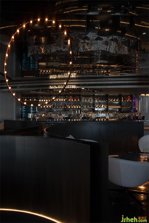 光,是我們對時間的基礎(chǔ)感知,環(huán)繞落地窗讓流動的時間呈現(xiàn)可視化,璀璨夜景盡收眼底,展開空間的敘事。高空酒吧設(shè)計環(huán)周有序分布的氛圍燈像正在運行的小行星,屋頂鏡面板拉長空間整體縱向感,賦予空中酒吧面向未知與神秘的寰宇視野,又或如同月光下的湖泊。
