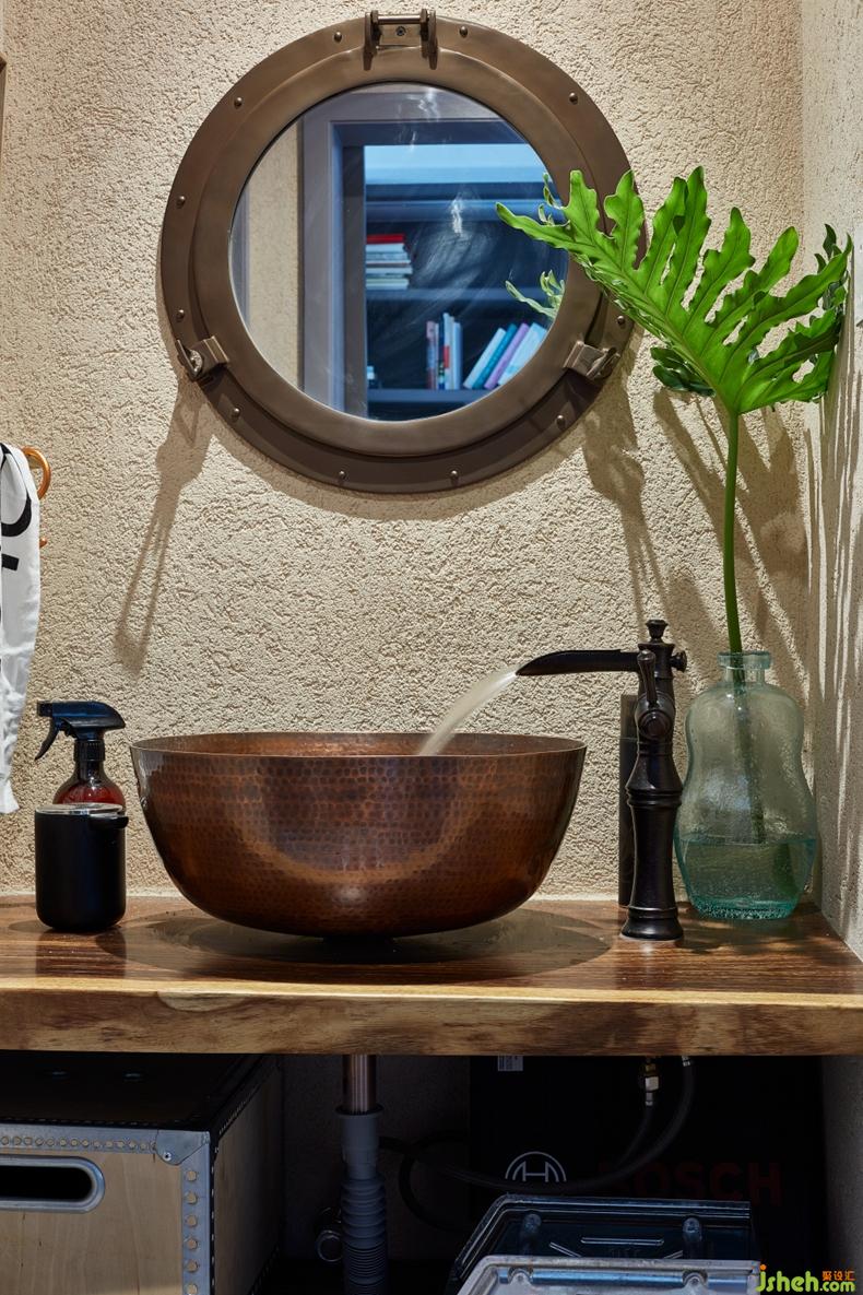 ▲ 實(shí)木板加臺(tái)上銅盆的洗手臺(tái)設(shè)計(jì),獨(dú)特另類。因?yàn)橐呀?jīng)干濕分離,墻面選用的都是防水的灰泥。所以防方面不用太擔(dān)心,不過平時(shí)還是要稍微勤快一點(diǎn)打理。想要特立獨(dú)行?還是簡單省事?畢竟魚和熊掌不可兼得,G先生做出了自己的選擇。