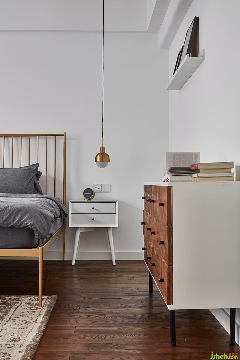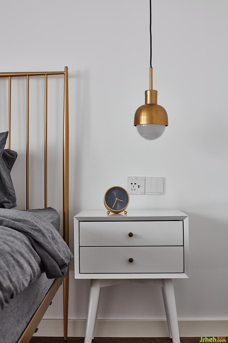 床纖細的金屬桿,顯得精致優(yōu)雅,床頭的兩盞吊燈,也是金屬感的,與床相呼應(yīng)。