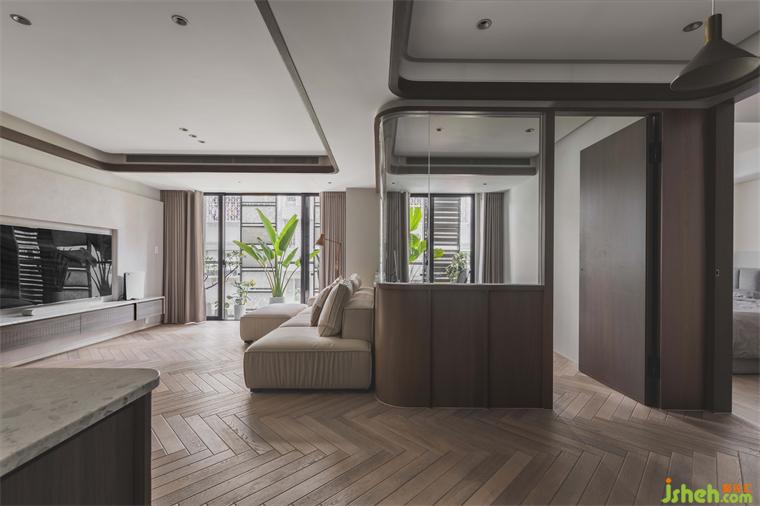 大平層設計不同於過往時代對於格局劃設分明的空間需求,如今小家庭的組成型態(tài)及擁塞的都市生活,讓人們益加嚮往開放空間及充足的光線視野。於是我們保留臨街道面的開窗優(yōu)勢,不做拆整修飾,僅運用紗簾及植栽做半遮掩,避免視線直穿入內(nèi),同時延攬窗外日光綠意,相偕室內(nèi)木質(zhì)調(diào)與水磨石,打造一處與自然共同呼吸吐納的生活場域。