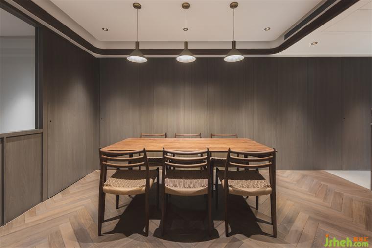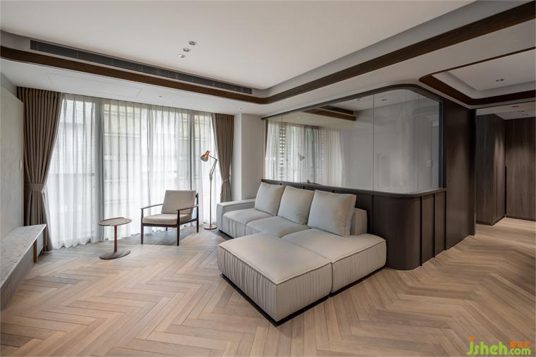 客廳天花板利用溝縫制造不同層次高度,同時定義場域性質(zhì),相偕人字拼地坪的漸進次序,大平層設計使視覺延展更添闊朗,此一概念延續(xù)至書房、餐廳,建立整體空間的一致性。