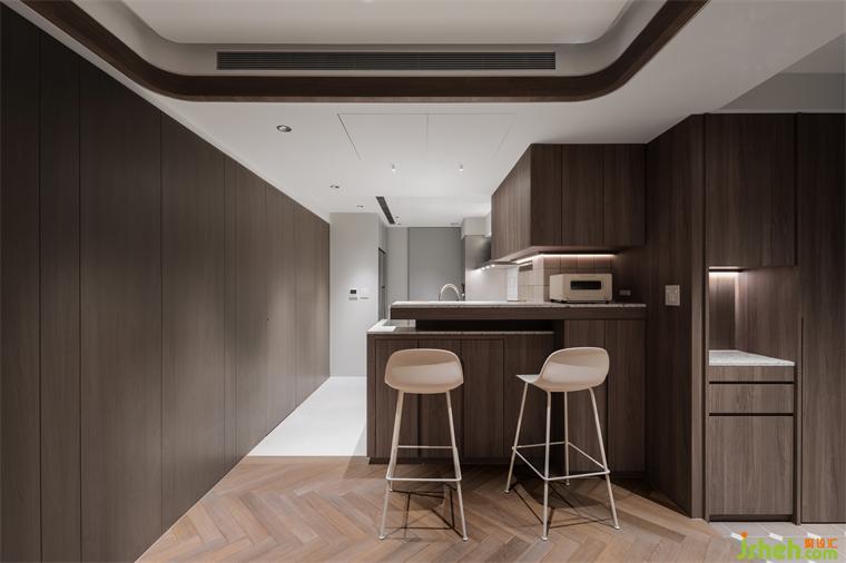 餐廳與廚房過道處,以相異材質(zhì)地坪,喻示空間轉換,并劃設一轉角吧臺,讓視線得以穿透,分而不隔建立對話平臺,方便女主人在料理時亦能關照家人。我們將廚具配置設定為L型動線,方便完成備料、烹煮等所有動作,也能一眼望見所需,依據(jù)置放邏輯,井然有序的完成料理。