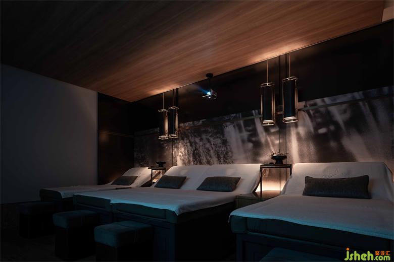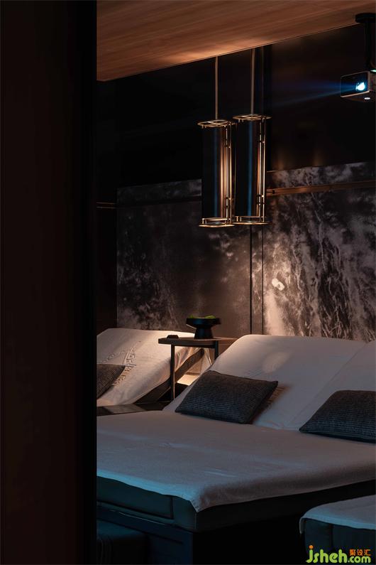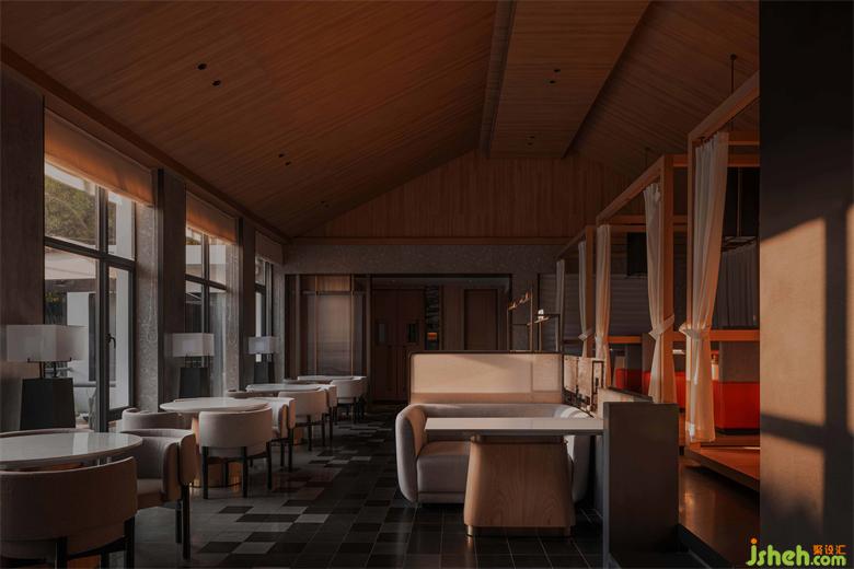 懸山頂?shù)奈蓓敱缓喕?,只保留了正脊和垂脊的線條碰撞在一起,呈現(xiàn)出幾何本質(zhì)的美。會館設(shè)計夜間以光作導(dǎo)引,簡約亦不失風(fēng)骨。不同的垂脊給室內(nèi)增添了不一樣的韻味,或曠達抒意,或典雅溫潤。設(shè)計師用大面積色塊在空間進行分割,使得其簡約但不簡陋,大氣規(guī)整。