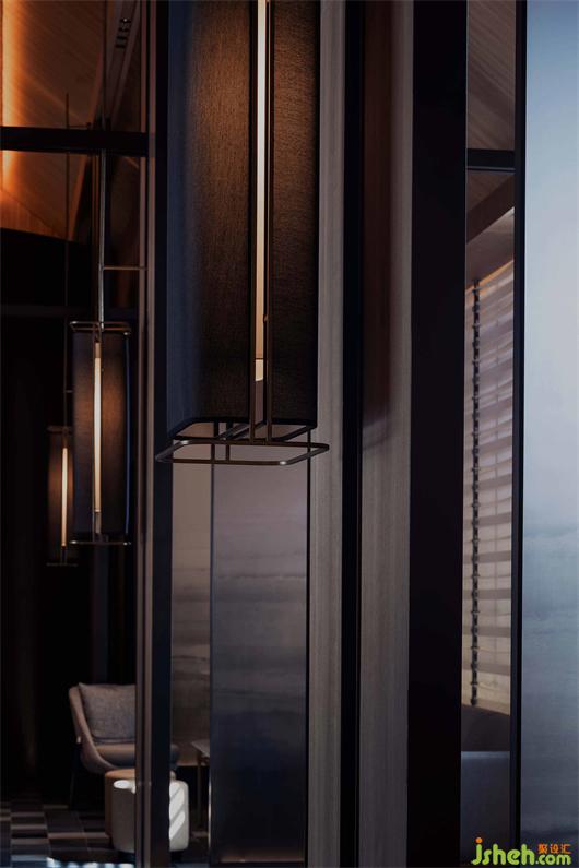 在物件比較冗雜的餐廳和大堂,設(shè)計師抽“框架”為形,行隔斷之用,所提煉之簡單外框,通直的線條元素運用在不同材質(zhì)和物件上,多而不雜,理繁為簡,將最可能凌亂的空間梳理地井井有條。