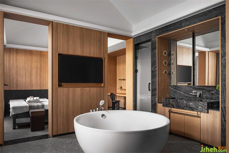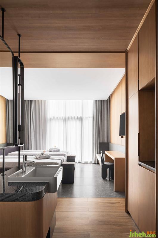 2人SPA包廂帶島型獨立浴缸,梳洗空間與按摩休息室以木門半隔,邊界模糊。會館設(shè)計懸山頂?shù)奈蓓斣诖碎g露出,極大地減少了島型浴缸帶來的曖昧感,卻留出十足放逸。按摩床所在的休息室落回寧靜收斂之氣,2人間也因屋頂之高不顯局促,從頂部垂下的燈盞給空間增加了纖細穩(wěn)定之美。