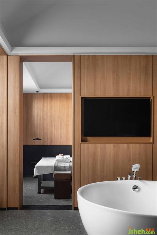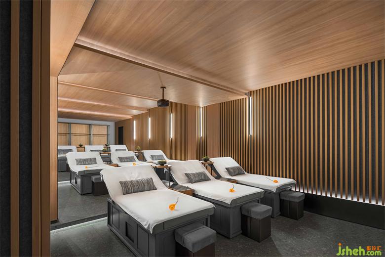 除此之外,養(yǎng)生館內還配有9人間的足浴影音室,室內分為三階,側立面飾以大面積木柵欄,整體感覺像一個小型電影院。