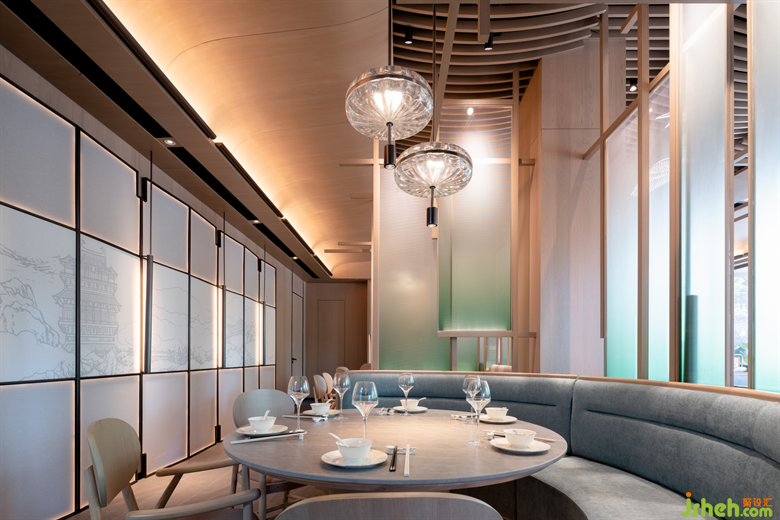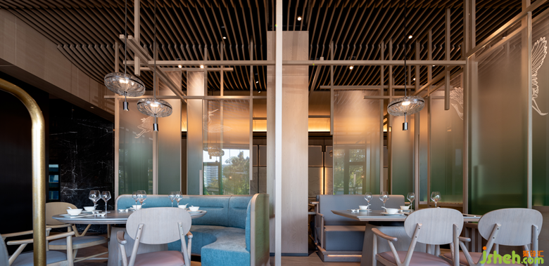 在來鶴臺廣場的滋奇臻品,餐廳設(shè)計師以木作框,以青色亞克力為隔斷,營造出透紗格柵的質(zhì)感,令光的滲入更具層次性的美感??臻g的內(nèi)飾凝聚著濃郁的傳統(tǒng)人文精神元素,呈現(xiàn)詩雅韻律。