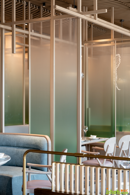 進(jìn)入零點區(qū),餐廳設(shè)計師不僅在設(shè)計中將東方空間氣質(zhì)與當(dāng)代視覺感受進(jìn)行融合,同時也融入了“江南飛檐”、“宋畫”、“園林構(gòu)成”等淮揚人文素材,并將提取的傳統(tǒng)淮揚元素進(jìn)行扁平化處理,同時使用折疊、疊加、拼貼等設(shè)計手法將抽象化元素進(jìn)行重構(gòu),形成一幅全新的、當(dāng)代的“淮揚長卷”。打造了零點區(qū)青蔥春日,白鶴飛舞上揚州的景象。