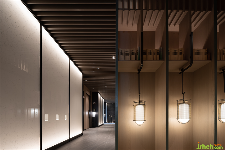 “幾百年人家無非積善,第一等好事只是讀書”,針對書香揚州,設計師在二樓包廂走廊空間精心設置了連門書架,銅色的精致燈具放置其中,顧客需要推開一側(cè)穿插“書架”中書卷氣息的門扇方能進入包廂中。另一側(cè)藏在和紙中的包廂仿佛置身于朦朧霧氣之中,更有一種江南之美。