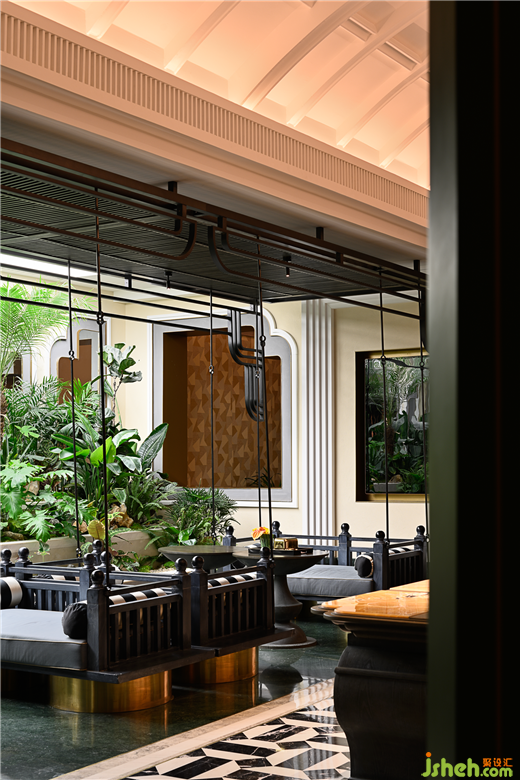 上瑞元筑融合不同的藝術(shù)風(fēng)格,為每個區(qū)域規(guī)劃了獨(dú)特的設(shè)計特點(diǎn)。從而創(chuàng)造一個充滿生機(jī)、奢華和優(yōu)雅氛圍的地方——充滿郁郁蔥蔥的綠色植物、精致的紋理和美麗的圖案。在青泰,上瑞元筑將華麗的藝術(shù)裝飾與中世紀(jì)時期的精致優(yōu)雅相融合,打造出展現(xiàn)溫暖色調(diào)、大膽印花和裝飾性飾面的空間。這種創(chuàng)造出一種放松感,使人們感覺像是在享受夏夜,增強(qiáng)旅程愉悅感。
