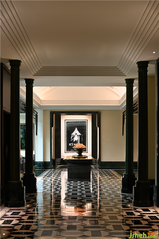天花板上白色透光方格與背景墻的巨幅花鳥畫作相得益彰,構(gòu)成了復(fù)古的精致。散發(fā)出古典韻味。精致的鑲嵌拼花和銅制飾品,搭配深色馬賽克地板和白色羅馬柱,進(jìn)一步提升了空間的高雅氛圍。