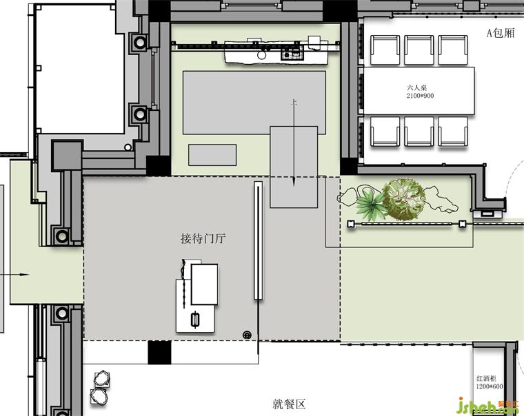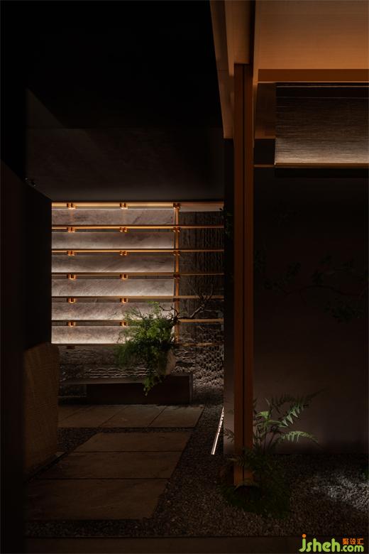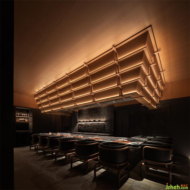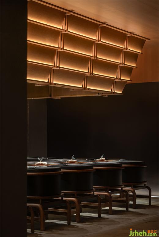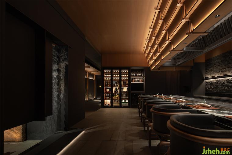 松聲靜夜聞,月光涵露重??臻g欲揚(yáng)先抑,素黑幽玄的環(huán)境中包含著對(duì)自然的敬意和縮影,雪松、巖石、明月,如在筆墨間。日料餐廳設(shè)計(jì)建筑并未寓意過多,沉寂幽玄的光影帶來的克制讓觀者將悲喜收于內(nèi),卻也牽出夢的絲線,掛于松雪之末,月隱婆娑處。