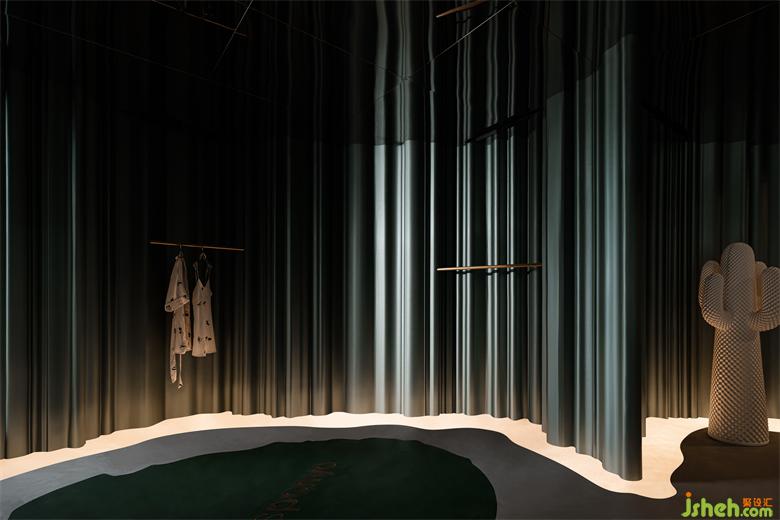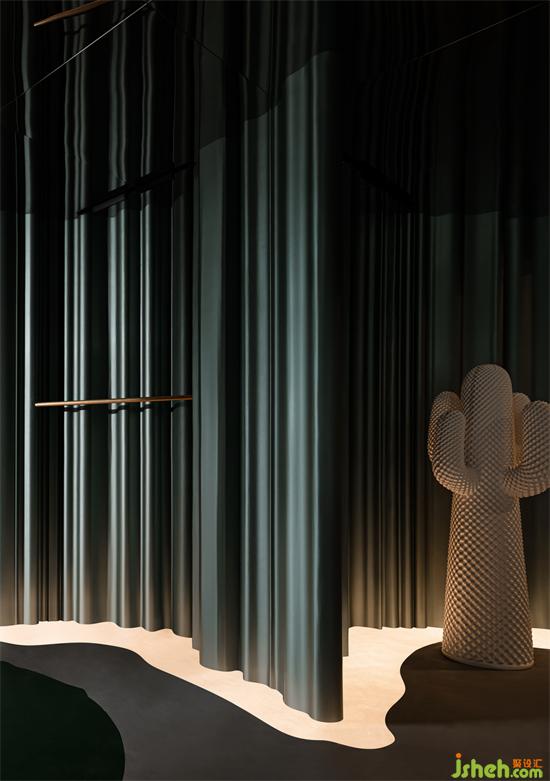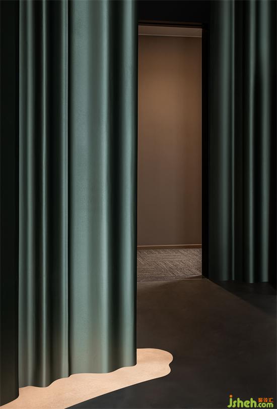 空間選用品牌的基本色墨綠色作為背景基調(diào),如瀑布般傾瀉而下的墨綠色隔墻,辦公室設(shè)計以絲綢漆模仿真絲內(nèi)衣質(zhì)感,拉開了空間的戲劇帷幕,垂墜下綠色華美流光,在地上漾起星河漣漪,自由無拘,蔓延流轉(zhuǎn)。