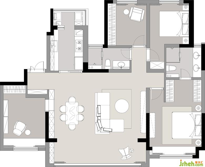 溫軟舒適的灰色沙發(fā)承載著日常的休閑活動。綠色沙發(fā)單椅的跳色,為空間增添了一抹富于希望的亮色,使得整個空間更加自然清新。