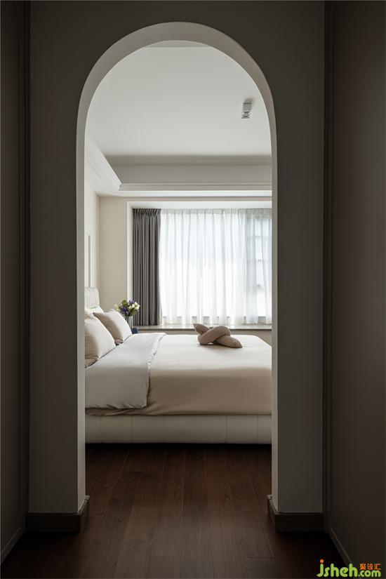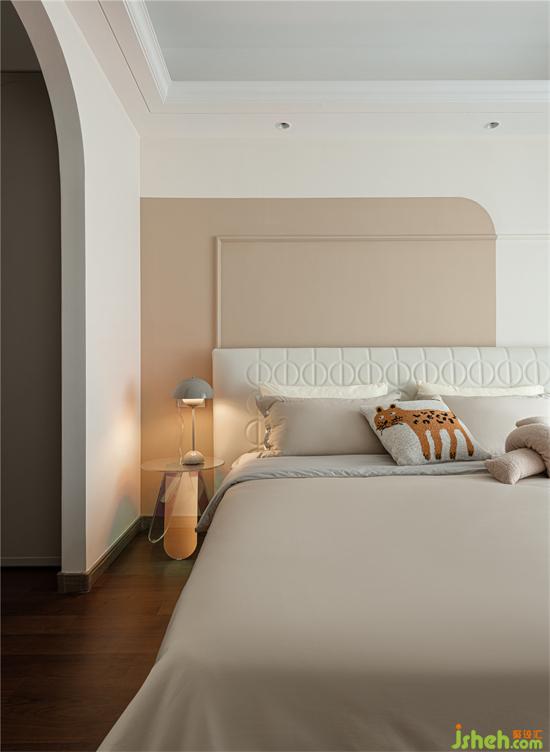 奶油小法式家裝設(shè)計(jì)師將主臥原有裝飾面予以拆除,利用線條與乳膠漆進(jìn)行背景分色。家裝設(shè)計(jì)同時,把衣帽間的門洞改成拱形門洞,邊頂增加石膏線條,精致細(xì)膩,增加儀式感。