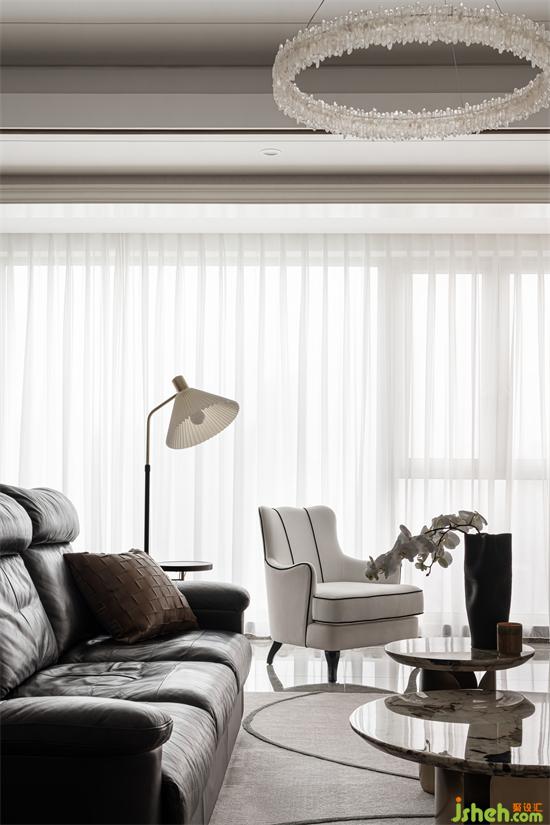 深色皮質沙發(fā)坐感舒適,獨具質感,流露出粗獷的自然之美。成都中鐵御花府家裝設計落地燈燈罩的白色傘狀形態(tài)讓整個現(xiàn)代空間別具輕盈靈動之感。地毯上的凝練抽象的藝術線條,富于動感與活力,為空間注入藝術情調的同時,在視覺上形成一種縱深的擴展效果,使空間層次更為豐富。