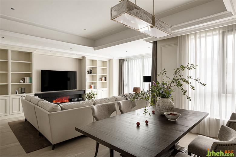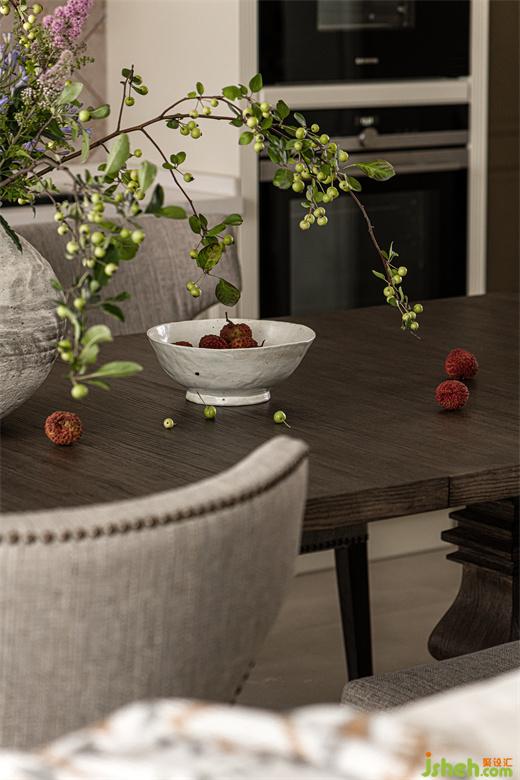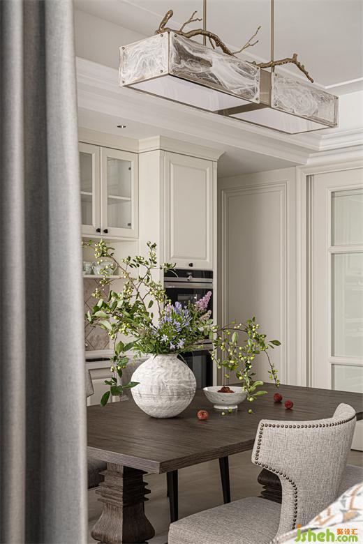 餐廳白色與金色相間的吊燈,華而不艷,上方樹枝造型遒勁硬朗,渲染出整個空間的自然氛圍。餐桌上古樸陶罐插滿生機勃勃的枝葉與花束,為用餐氛圍注入了更多的自然與活力。