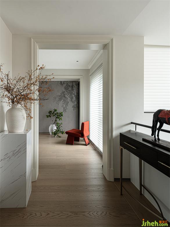 走廊一側的展示架上,擺放著精心挑選的馬形雕塑,靜謐之中又包蘊著一種爆發(fā)力,為整個走廊增添了更多的藝術張力。植物的穿插渲染,蔥郁盎然,流露出鮮活的生氣。