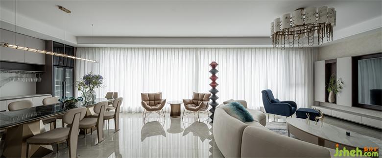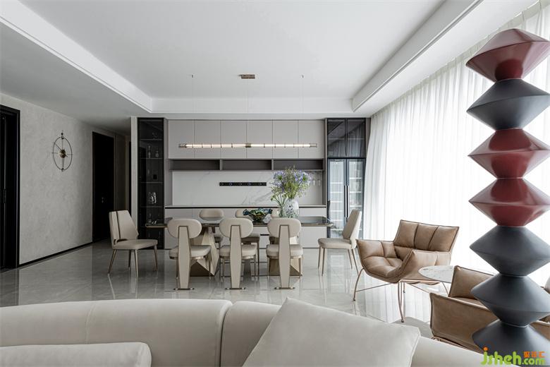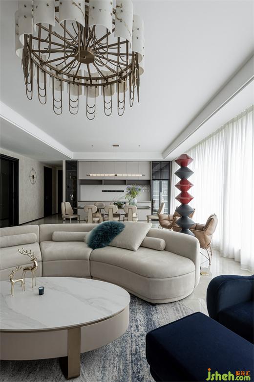 樹立在客廳的立體幾何雕塑給空間平添些許藝術(shù)氣息,與整個室內(nèi)環(huán)境形成一種和諧共生之美。藍(lán)色暈染的抱枕與沙發(fā)椅、地毯的色彩相呼應(yīng),為整個空間注入一些亮色,散發(fā)出精雅獨(dú)特的浪漫意趣。