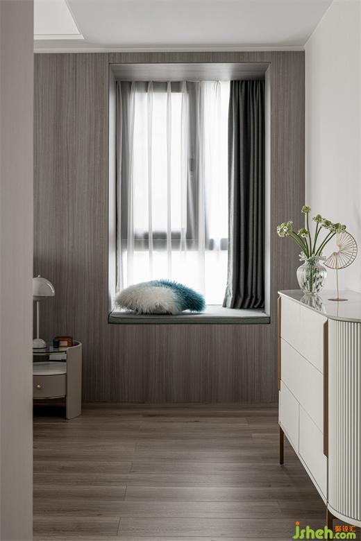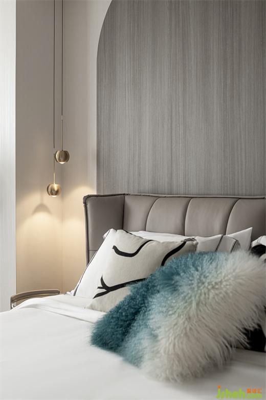 主臥空間明亮開敞,讓人步入其中即有一種視覺上的放松感。主臥的背景墻采用木質(zhì)弧形設(shè)計(jì),紋理細(xì)膩,頗具質(zhì)感。