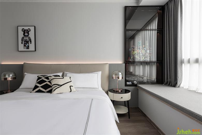 背景墻以灰色的深淺進(jìn)行過渡,背后溫馨的燈光為舒適的休憩提供了絕佳的條件。黑色玻璃展示柜中陳設(shè)著居住者喜歡的樂高積木,家裝設(shè)計(jì)凸顯著其獨(dú)特的個(gè)性愛好。