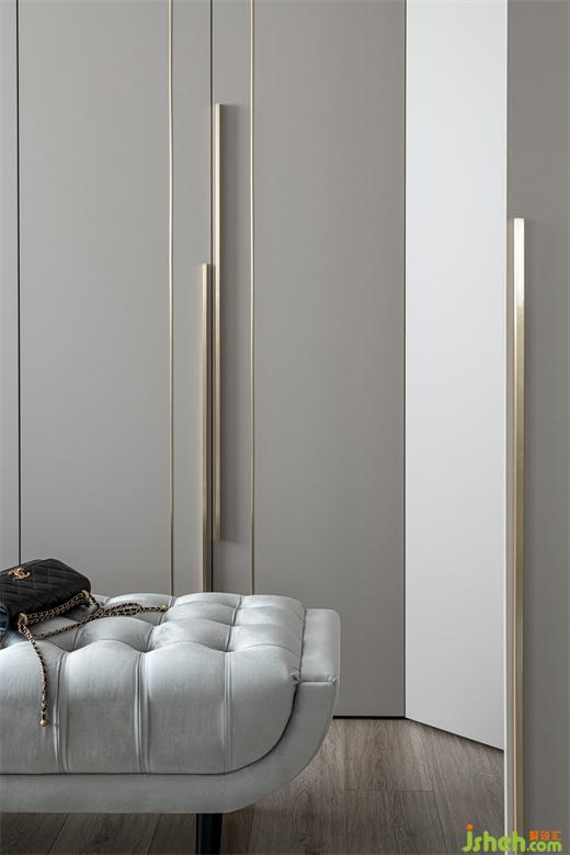 衣帽間遵循著極簡設(shè)計(jì)原則,家裝設(shè)計(jì)將收納利用到極致,整潔有序,金色的把手點(diǎn)綴既呼應(yīng)了空間的輕奢調(diào)性,又極具美觀性。