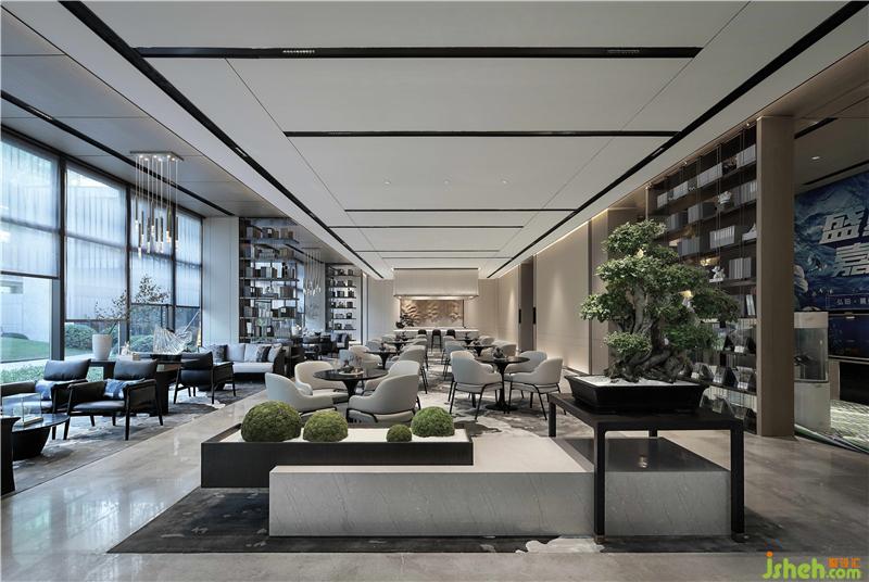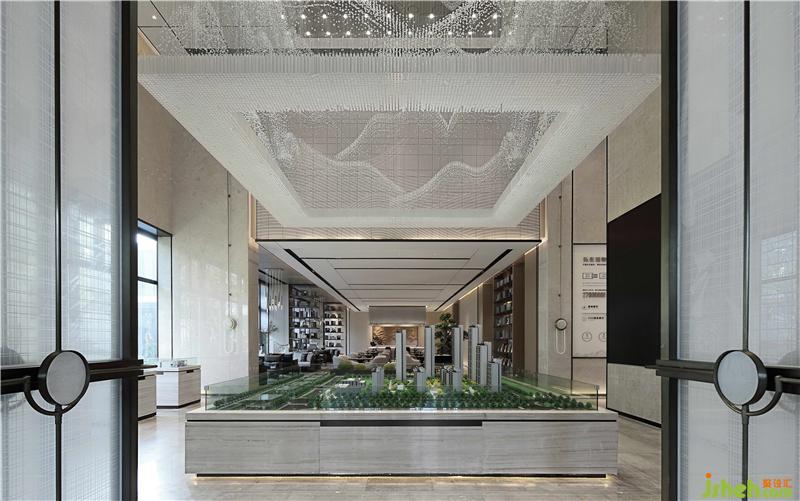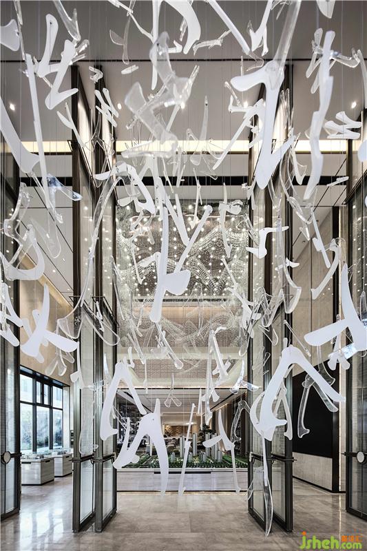 在兩層挑高的接待廳,一幅抽象山水意向圖,