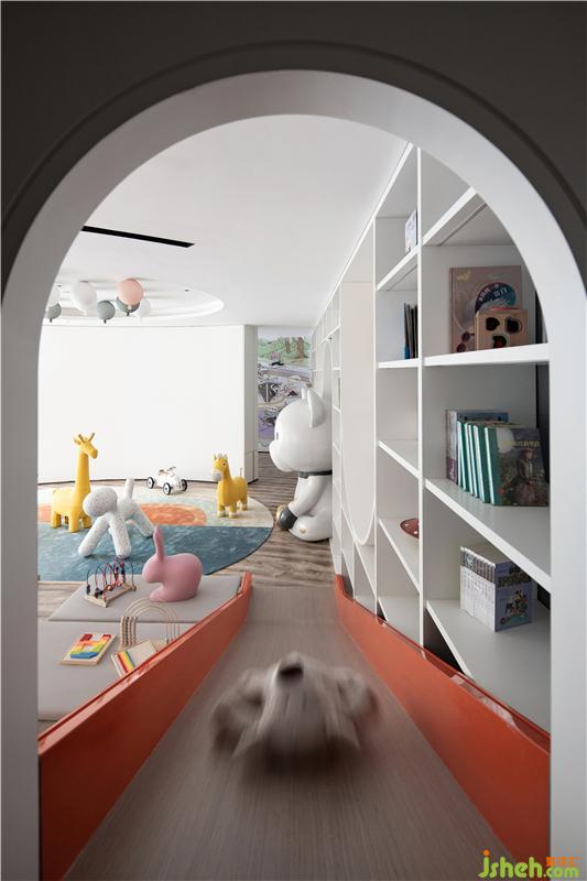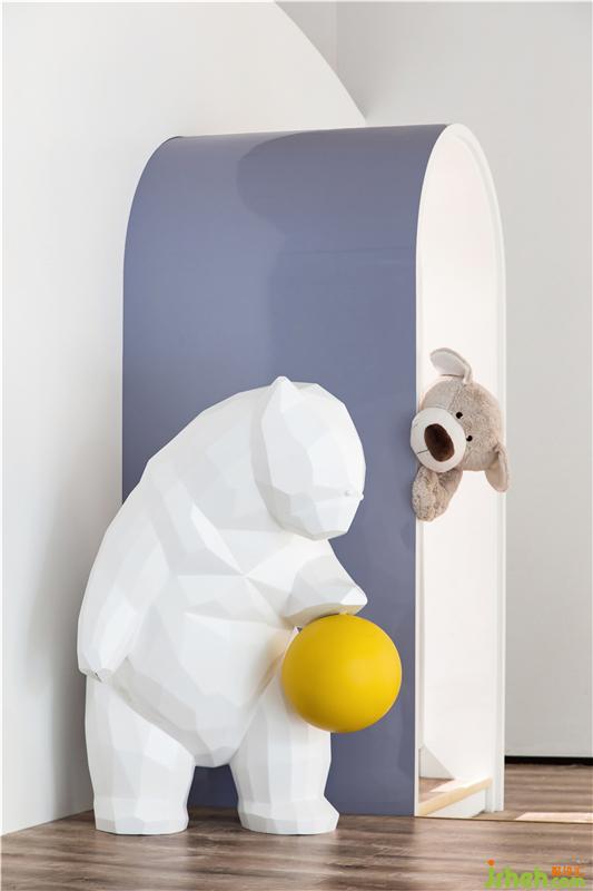 設(shè)計者對購房者產(chǎn)生的共情,基于能進(jìn)入他人的情境,感受他人的情緒,才能最終引發(fā)共鳴?;诮ㄖw本身的格局,設(shè)計者從成人考慮的安全性、兒童使用的體驗感雙重需求出發(fā),既從動線和材質(zhì)上滿足安全性,讓兒童處于家長的視線范圍之內(nèi),并以旭輝集團(tuán)專為兒童區(qū)打造的小熊IP為主題,為孩童們打造了一處童話樂園,也讓成人心生對于美好生活的憧憬。