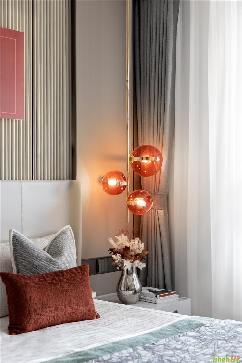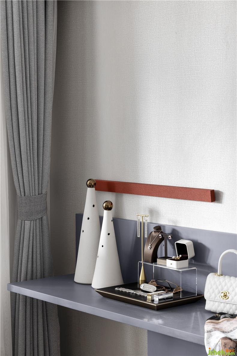 主臥運(yùn)用莫蘭迪色系進(jìn)行區(qū)域劃分,不爭(zhēng)不搶、不濃重、不妖嬈,高級(jí)又低調(diào)。梳妝臺(tái)墻面上升起滿月,仿佛在訴說著夜晚的浪漫。主臥不同材質(zhì)飾品與整個(gè)空間相得益彰樣板房設(shè)計(jì)。