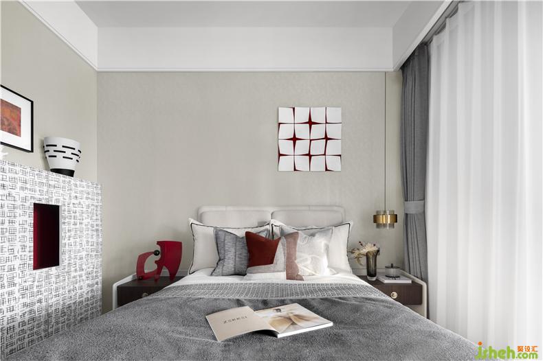 次臥斗柜如一幅抽象畫,又如一件藝術(shù)品,兼具收納又將生活美學(xué)表現(xiàn)得淋漓盡致。樣板房設(shè)計(jì)次臥背景墻面立體幾何紅白裝置物,與斗柜、織品遙相呼應(yīng),穿梭在時(shí)間與空間的隧道中